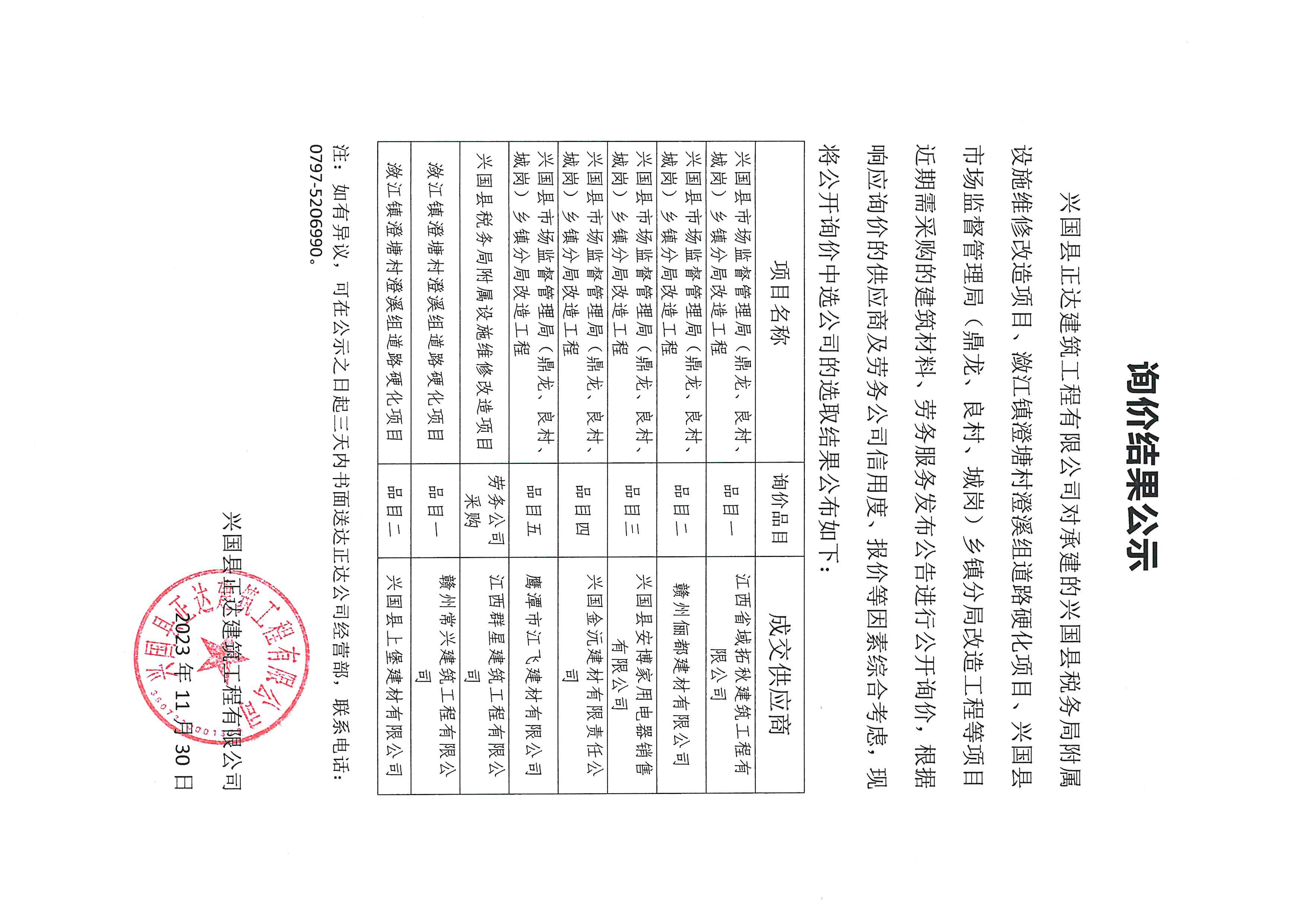興國(guó)縣稅務(wù)局附屬設(shè)施維修改造等項(xiàng)目材料、勞務(wù)服務(wù)公開(kāi)詢價(jià)結(jié)果公示