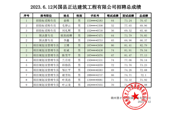 根據(jù)《興國縣正達(dá)建筑工程有限公司2023年第二季度公開招聘公告》規(guī)定的條件和程序,公司于2023年6月3日、6月11日開展了公開招聘人員筆試、面試工作。按照筆試占30%、面試占70%折算綜合成績,根據(jù)對應(yīng)崗位招聘人數(shù)1:1的比例,從高分到低分的順序確定體檢與背景調(diào)查人選,現(xiàn)將入圍體檢及背景調(diào)查名單公示如下: